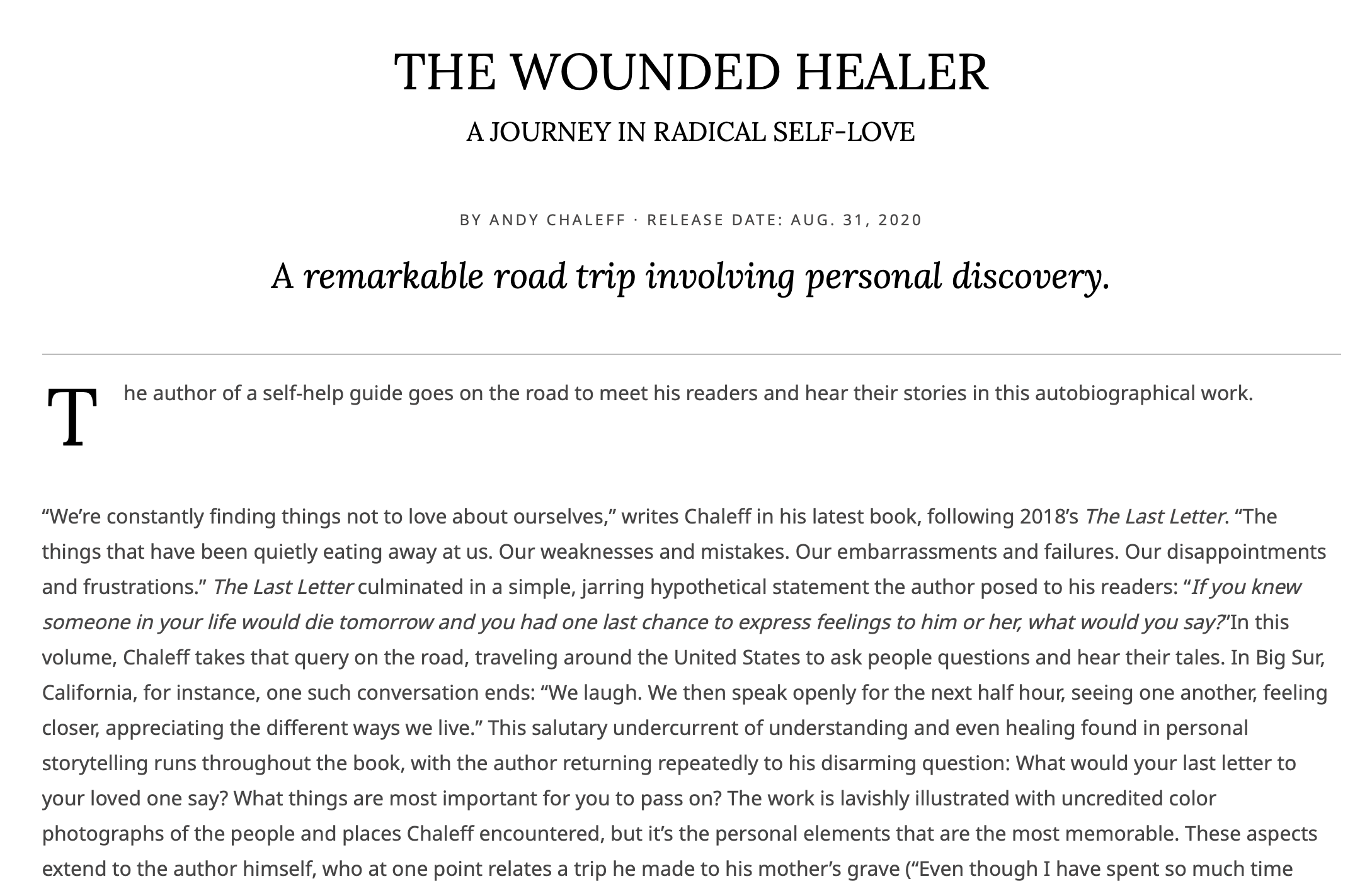Winner of two book competitions and awarded the "Get it" accolade by Kirkus Reviews, The Wounded Healer is more than just an autobiographical work—it is a guide to healing and unconditional self-embrace. Whether you're seeking personal growth, philosophical wisdom, or simply a story of human connection, The Wounded Healer is a remarkable road trip of personal discovery that will resonate with anyone on a path of self-improvement and radical acceptance.